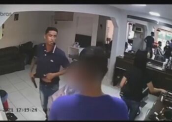 Nas imagens, \u00e9 poss\u00edvel ver que a cabeleireira mostrava o resultado do corte para o suspeito quando ele levantou, sacou uma pistola da cintura e anunciou o assalto. O homem pareceu gritar com as v\u00edtimas e tomou o celular da m\u00e3o do dono do estabelecimento e do cliente. <\/p>\n\n\n\n