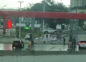 Em v\u00eddeo gravado mostra o momento em que o forte vento atinge o local. Um dos frentistas do posto de gasolina quase \u00e9 atingido pelo forro do estabelecimento que caiu.<\/p>\n\n\n\n