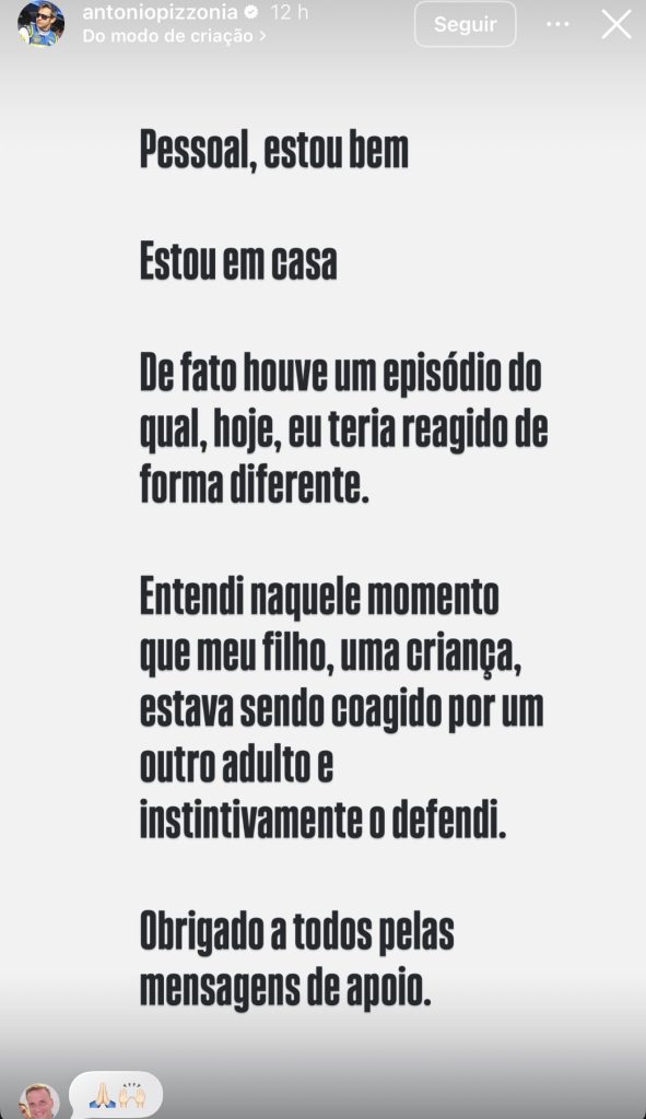 Pizzônia atribuiu suas ações ao impulso de proteger o filho de 13 anos. “Entendi naquele momento que meu filho, uma criança, estava sendo coagido por um outro adulto e instintivamente o defendi”, explicou.