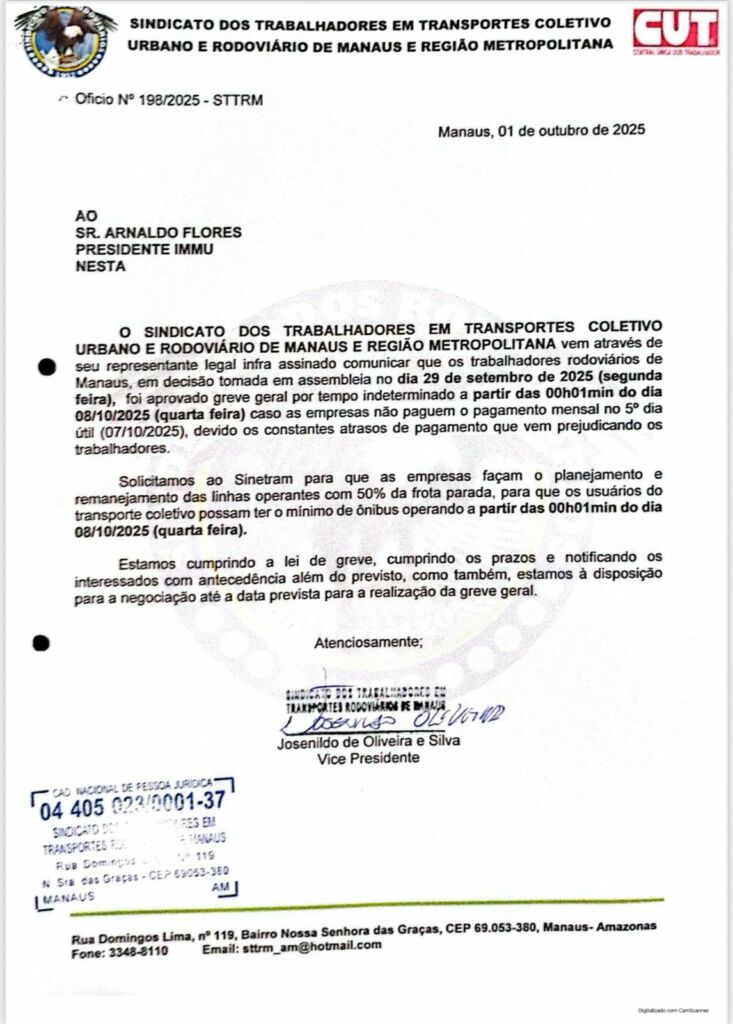 O Sindicato dos Trabalhadores em Transportes Coletivo Urbano e Rodoviário de Manaus e Região Metropolitana (STTRCUR) anunciou, nesta sexta-feira (4), que irá deflagrar uma greve geral por tempo indeterminado a partir da meia-noite de quarta-feira (8). A paralisação será mantida caso as empresas de ônibus não realizem o pagamento dos salários até o quinto dia útil, que vence na terça-feira (7).