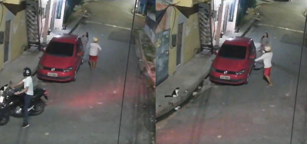As imagens começam com uma cena cotidiana: três pessoas aparecem na rua, um casal entra em um carro estacionado e uma terceira sobe as escadas de uma casa. Pouco depois, mais quatro indivíduos surgem no vídeo. Três seguem caminhando, mas a quarta, que é a futura vítima, para ao lado do veículo para conversar com a pessoa que estava na escada.