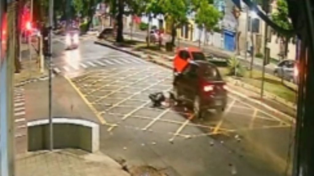 Imagens de câmeras de segurança mostram o exato momento em que um motorista, trafegando na contramão, atropela um casal em uma motocicleta nas proximidades do Terminal 1 (T1), na madrugada desta quinta-feira (11). O vídeo registra o carro avançando pela faixa invertida até atingir a moto com força, arremessando as vítimas ao chão.
