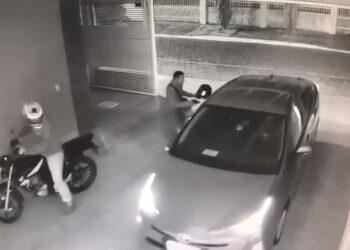A imagem mostra que os suspeitos estavam em uma motocicleta e entraram na casa logo ap\u00f3s o ve\u00edculo do morador, enquanto o port\u00e3o da garagem ainda estava aberto. Um dos criminosos desce do ve\u00edculo, tira o capacete e, ao perceber que a v\u00edtima tentava fugir, apontou a arma na dire\u00e7\u00e3o do condutor, apertou o gatilho, mas o rev\u00f3lver falhou em todas as tr\u00eas tentativas.<\/p>\n\n\n\n