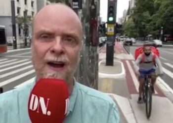 A a\u00e7\u00e3o foi filmada e, ap\u00f3s o ciclista tentar puxar o celular, o jornalista corre atr\u00e1s dele gritando em portugu\u00eas. \"Desgra\u00e7ado, ei, pol\u00edcia, pega esse cara\", afirmou o jornalista no v\u00eddeo, correndo atr\u00e1s do ladr\u00e3o.<\/p>\n\n\n\n