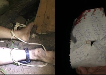 De acordo com a Pol\u00edcia Militar, a v\u00edtima estava sem documentos, com as m\u00e3os e p\u00e9s amarrados, al\u00e9m de ter a cabe\u00e7a coberta por um saco. O homem apresentava sinais de tortura e era monitorada por tornozeleira eletr\u00f4nica. O corpo foi encontrado nas proximidades de um rip-rap. Ao lado dele, a pol\u00edcia encontrou um bilhete com a frase: \"Recado pra quem fecha com safado\". <\/p>\n\n\n\n