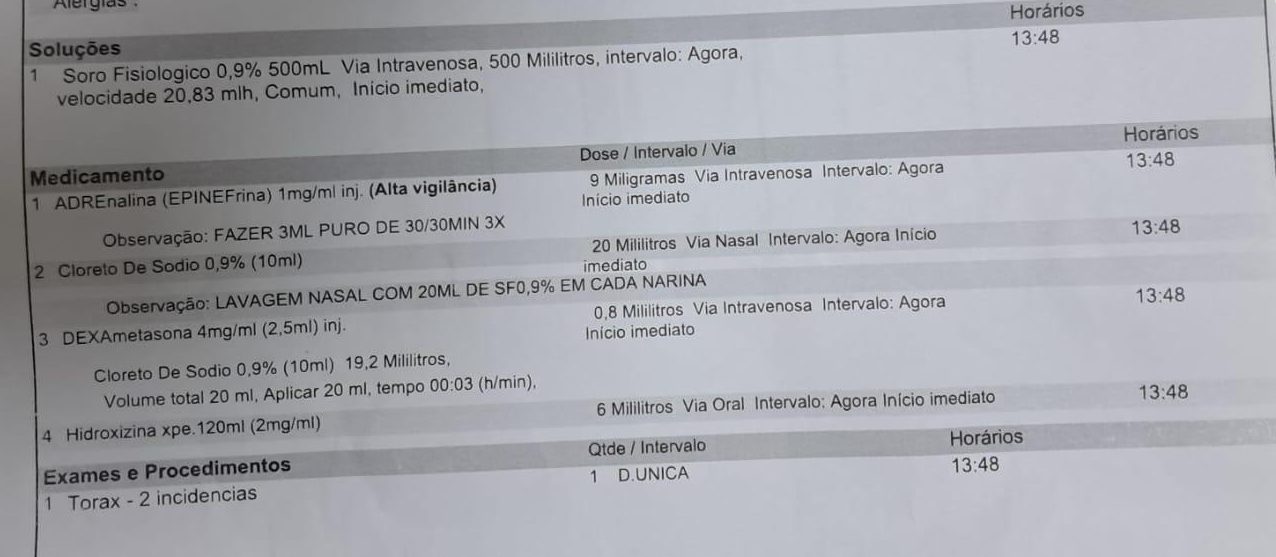 De acordo com o relato do pai, o engenheiro mecânico Bruno Freitas, a criança estava com um quadro gripal, caracterizado por tosse seca e suspeita de laringite. A médica teria então prescrito o medicamento por via intravenosa: três doses de 3ml a cada 30 minutos. A família estranhou a nova forma de aplicação, já que o menino só havia recebido o remédio por nebulização, em outras vezes que teve o mesmo quadro.