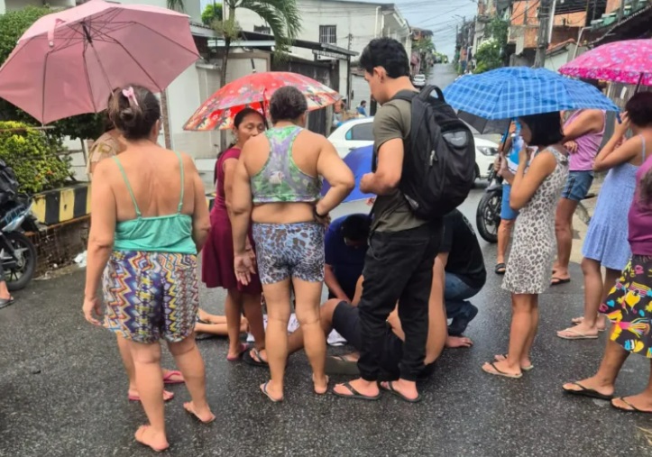 Uma imagem mostra a vítima no chão cercada por vizinhos e um tio, que seria a pessoa com mochila nas costas. Autoridades estão levando informações sobre a ocorrência.
