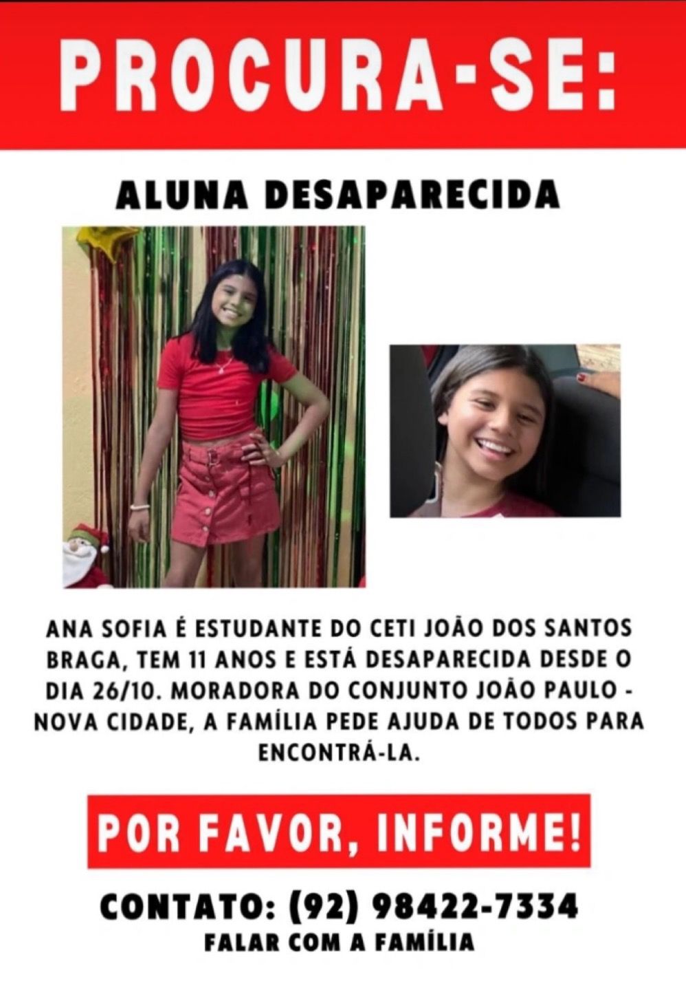 Quem souber onde ela está ligue para o número (92) 98422-7334 ( família), ou para a polícia.