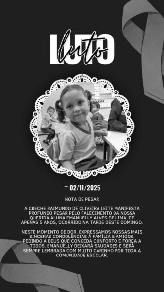 A creche Raimundo de Oliveira Leite, onde a menina estudava, emitiu uma nota de pesar expressando o profundo impacto da perda em toda a comunidade escolar. A instituição descreveu Emanuelly como “uma criança carinhosa, alegre e muito querida”, pedindo a Deus que confortasse o coração dos familiares e de todos que tiveram a alegria de conhecê-la.