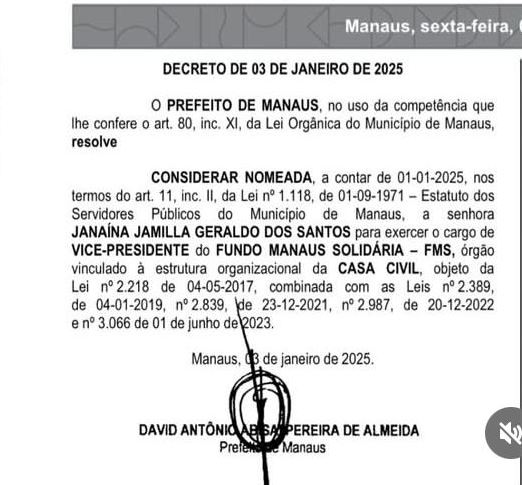 A empresária Janaína Jamilla, dona da loja de multimarcas Casa Janaína Jamilla, localizada no conjunto Vieiralves, Zona Centro-Sul de Manaus, e personal stylist da primeira-dama do município, Izabelle Fontenelle Almeida, foi beneficiada pelo prefeito reeleito, David Almeida, nesta sexta-feira (3). Mesmo perdendo as eleições passadas, ela foi nomeada para a Casa Civil e vai ganhar um salário que pode chegar aos R$ 19 mil.