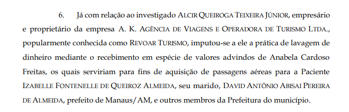 O empresário afirmou ainda não ter contrato formal com a Prefeitura de Manaus e que os serviços eram prestados a pessoas físicas, com pagamento intermediado por Anabela Cardoso em espécie para quitar despesas de lazer da “família Almeida”.