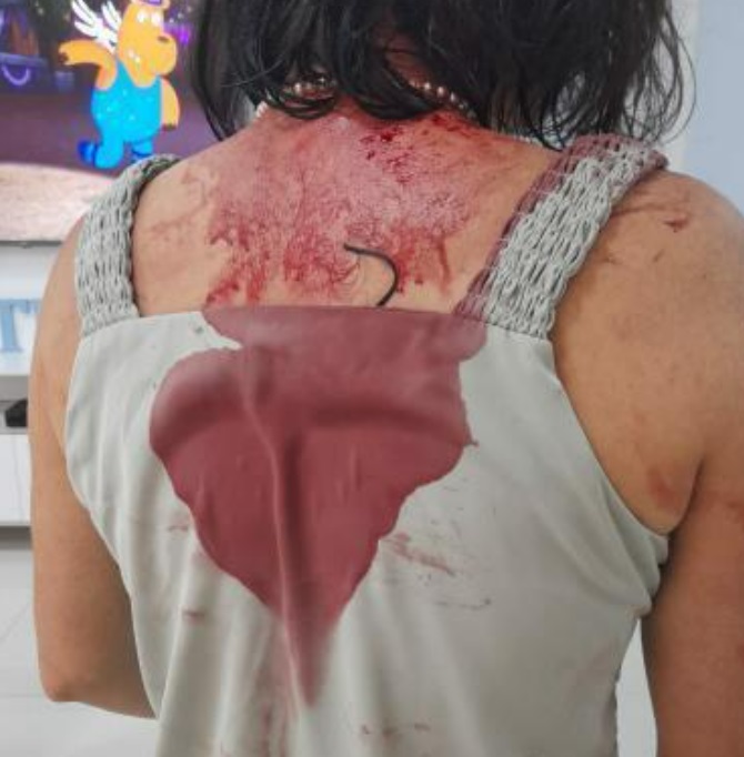 Rafaela diz foi que enforcada, e apresenta as fotos dos ferimentos, inclusive coberta de sangue. A esposa ainda diz que foi obrigada a manter relações sexuais com o advogado, o que caracteriza estupro.