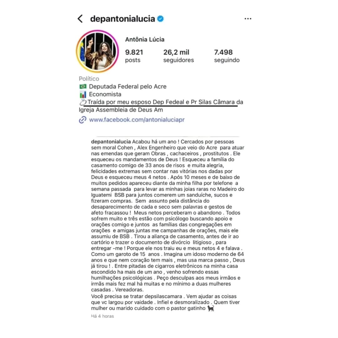 Uma suposta nova traição do pastor e deputado federal Silas Câmara (Republicanos-AM) foi denunciada nesta terça-feira (2) por sua esposa, a deputada federal Antônia Lúcia (Republicanos-AC), nas redes sociais. Além de relatar “humilhações psicológicas” e traição com duas vereadoras casadas, a parlamentar sugeriu que o deputado também gosta, supostamente, de se relacionar com homens.