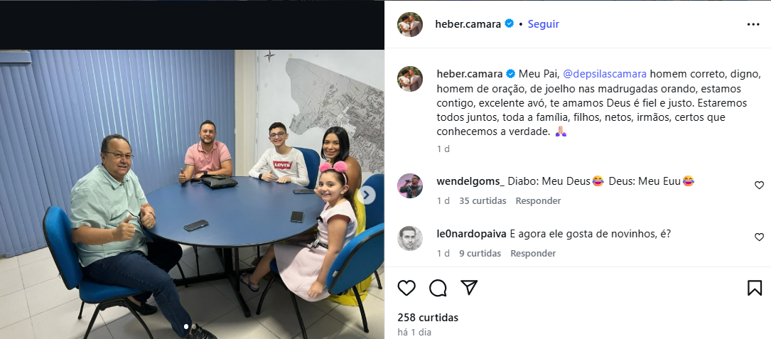 Em um post mais enxuto, publicado nesta quarta-feira (3) nas redes sociais, Heber destaca várias qualidades do pai. Sem falar sobre a polêmica em torno da família, o filho ressaltou que toda a família está a favor de Silas.