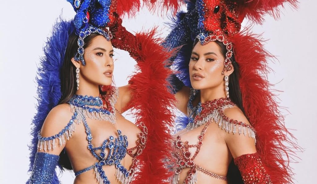 A cunhã-poranga do Garantido desfilou com um look conceitual inspirado no Festival de Parintins, importante manifestação folclórica da Amazônia. A produção cuidadosamente elaborada sintetizou os elementos e as cores emblemáticas dos dois bois que se enfrentam na arena bumbódromo: o azul do Boi Caprichoso e o vermelho do Boi Garantido.