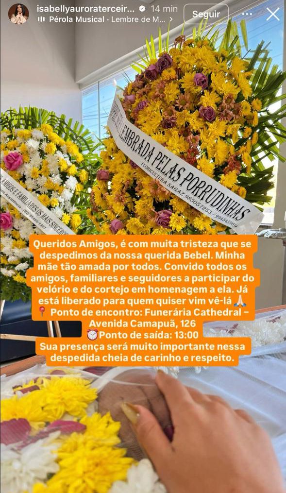 Isabelly também convidou amigos para a despedida, que está sendo realizada na funerária Cathedral, na avenida Camapuã, Zona Norte. O acesso já está liberado para todos. O cortejo até o enterro está marcado para as 13h. “Sua presença será muito importante nessa despedida cheia de carinho e respeito”, escreveu a filha.