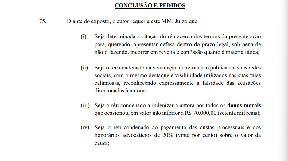 A defesa da cantora, assinada pelos advogados Gustavo Mizhahi, Felipe V. Rei, Yuri Paesleme e Thayná Costa, pede uma indenização de R$ 70 mil e uma retratação pública, sob pena de multa diária em caso de descumprimento. O processo inclui como anexo publicações das redes sociais que repercutiram as acusações, demonstrando o alcance do episódio.