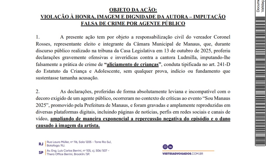 O show em questão, que encerrou o evento promovido pela Prefeitura de Manaus, ocorreu na madrugada do dia 7 de setembro e reuniu milhares de pessoas. Segundo a ação, quando o vereador falou: “Não sabemos ainda quanto a Ludmilla gastou, aliás, embolsou pra vir aqui aliciar nossas crianças”, a afirmação foi classificada como falsa, ofensiva e que ultrapassa os limites da liberdade de expressão e da imunidade parlamentar, causando grave dano à honra e à imagem da artista.