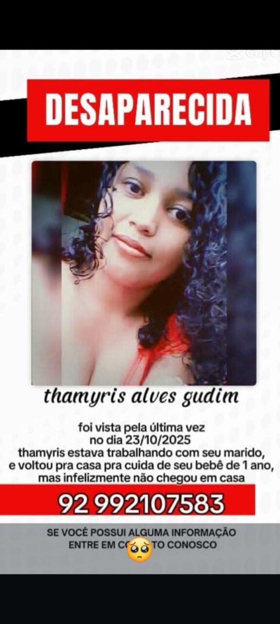 Tamires Cristina Alves Gudim, de 30 anos, está desaparecida desde a madrugada de quinta para sexta-feira (23). A família, em estado de angústia, relata que ela foi vista pela última vez ao entrar em um veículo de aplicativo, após deixar seu local de trabalho em um evento na Ponta Negra, Zona Oeste d Manaus.