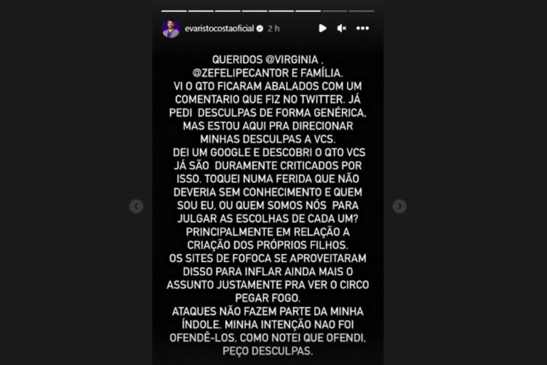 “Os sites de fofoca se aproveitaram disso para inflar ainda mais o assunto justamente para ver o circo pegar fogo. Ataques não fazem parte da minha índole. Minha intenção não foi ofendê-los, como notei que ofendi, peço desculpas”, concluiu Evaristo Costa em seu pedido de desculpas.