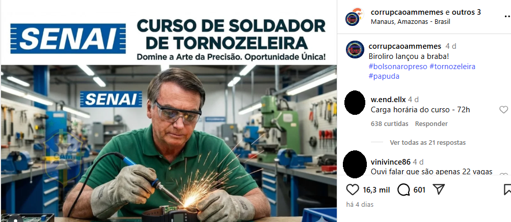 A postagem mostra uma imagem de Inteligência Artificial (IA) com o rosto do ex-presidente fazendo uma solda. “Curso de soldador de tornozeleira. Domine a arte da precisão. Oportunidade única!”, acompanha o meme, que já tem mais de 16 mil curtidas e estampa várias matérias de portais nacionais.