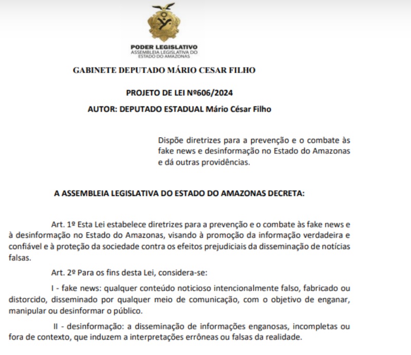 O projeto tramita na Assembleia Legislativa do Amazonas (Aleam) e tem caráter repressivo. O deputado afirma que o PL não vai ferir a liberdade de expressão.