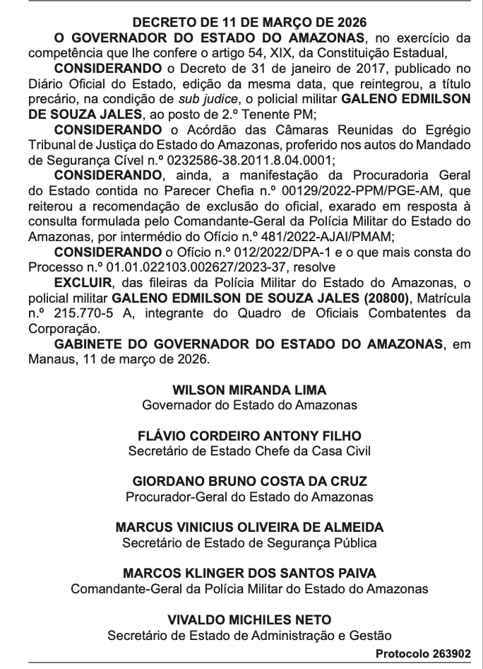 O policial militar Galeno Edmilson de Souza Jales foi excluído definitivamente dos quadros da Polícia Militar do Amazonas (PMAM) em decreto assinado pelo governador Wilson Miranda Lima no dia 11 de março de 2026. A medida é a resposta administrativa a um esquema que permitiu a saída irregular de 23 policiais do Núcleo Prisional da corporação, unidade que estava sob seu comando.