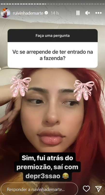MANAUS, AM  – “Se você tem amor à sua vida e à sua saúde mental, não entre na Fazenda”. A declaração foi dada pela influenciadora amazonense Ruivinha de Marte, nos stories do seu Instagram.