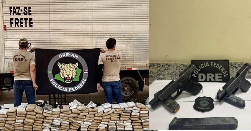 Com o apoio de cão farejador da Polícia Federal, foram localizados tabletes de drogas ocultos nas paredes de freezers acondicionados no baú do caminhão. Durante a ação, foram apreendidos 182 kg de maconha, além de duas pistolas calibre 9 mm com numeração raspada, carregadores e munições calibre 9 mm.