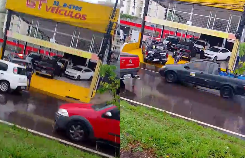 Vídeos gravados por testemunhas e divulgados nas redes sociais mostram funcionários em estado de desespero do lado de fora da concessionária, enquanto os suspeitos permanecem dentro do prédio. A intensa movimentação policial causou lentidão no trânsito do trecho.