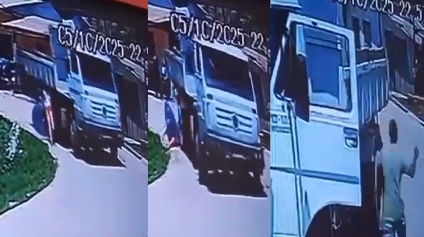 Uma câmera de segurança gravou a tragédia que vitimou uma mulher em Jutaí, nesta segunda-feira (6). A vítima estava caminhando de sombrinha, quando o caminhão passa e a derruba.
