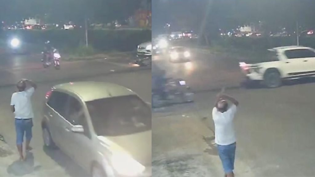 Imagens de câmeras de vigilância mostram o momento do grave acidente entre uma pick-up e uma motocicleta ocorrido na noite de sábado (3), na Avenida Passarinho, no bairro Monte das Oliveiras, zona norte de Manaus. A colisão envolveu uma Hilux branca e deixou o motociclista José Airton Freitas da Silva gravemente ferido.