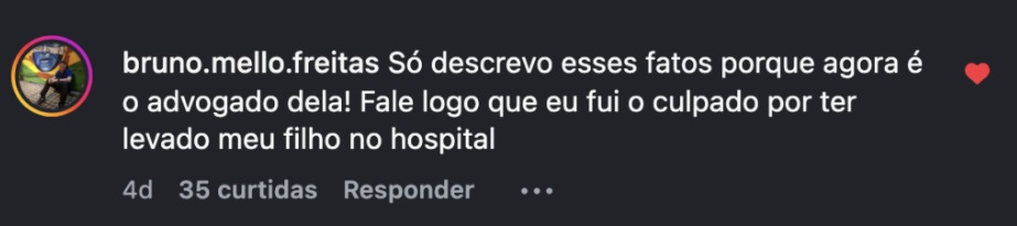 O pai de Benício reagiu nas redes sociais e disse que daqui a pouco ele é quem vai ser o culpado.