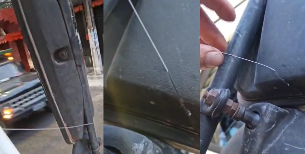 Uma cena inquietante grava por um caminhoneiro em Manaus causou medo neste fim de semana. Uma linha de cerol cortou o retrovisor do caminhão dele, perto da Manaus Moderna, no Centro, onde muita gente solta papagaio passando cerol na linha, o que é proibido por lei.