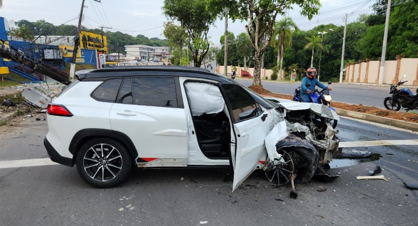 O domingo (28) começou com um acidente na Avenida do Turismo, na Ponta Negra, Zona  Oeste de Manaus, onde um carro derrubou poste e ficou atravessado na via.