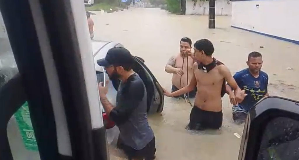 O temporal que atinge Manaus neste sábado (4) transformou a avenida Torquato Tapajós em um cenário de caos, com alagamentos severos que comprometeram o tráfego de veículos. Em meio à via alagada, um automóvel ficou completamente ilhado, levando um grupo de populares a se mobilizar numa tentativa heroica de resgatar o veículo.