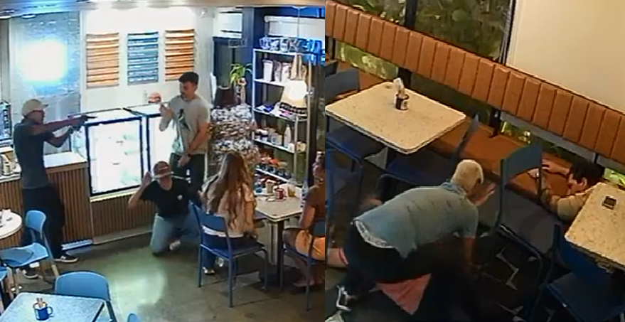 Uma câmera de segurança registrou toda a ação que, apesar de ter durado poucos minutos, foi bastante atribulada. Clientes foram colocados no chão, funcionários se desesperam e os pertences foram roubados. Um dos bandidos fingiu ser cliente e depois puxou a arma, causando todo o pânico.