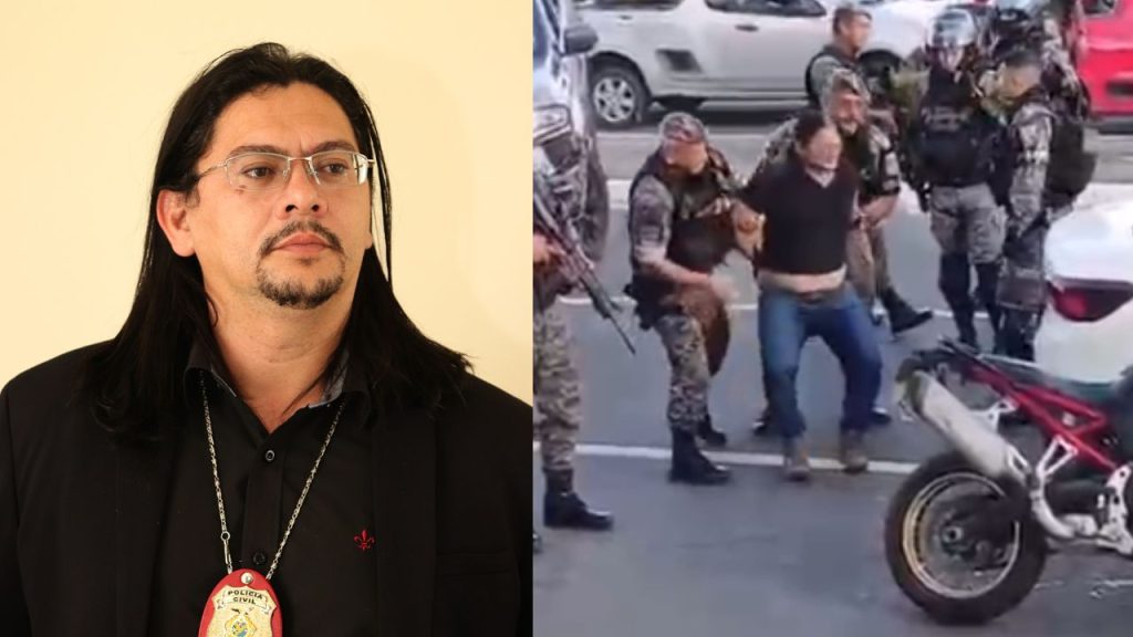 No vídeo, o delegado aparece sendo retirado de um veículo e colocado no chão pelos agentes, que utilizam força para contê-lo. A ação ocorreu em via pública.