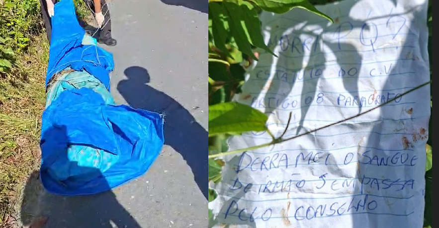 Durante os trabalhos periciais, os agentes encontraram um bilhete junto ao cadáver cujo conteúdo sugere motivação ligada à criminalidade. O texto trazia a seguinte afirmação: “morreu porque derramou o sangue de um irmão sem passar pelo conselho do CV AM”. A mensagem indica que a vítima teria cometido um homicídio não autorizado pela liderança da facção, o que resultou em sua execução como forma de punição interna.