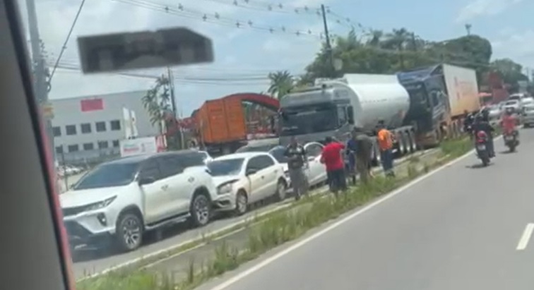 Um engavetamento envolvendo cinco carros, sendo duas carretas, deixou a Avenida Torquato Tapajós parada hoje à tarde. Apesar de ser uma reta, com 60 km de velocidade máxima, e com radares, nem assim a via escapou de mais um acidente.