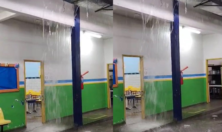 Alunos e professores registraram o pátio da escola inundado pela água e a cachoeira caindo do teto na Zona leste da cidade. Até agora a Semed não se pronunciou sobre porquê deixou a escola chegar a esse ponto.