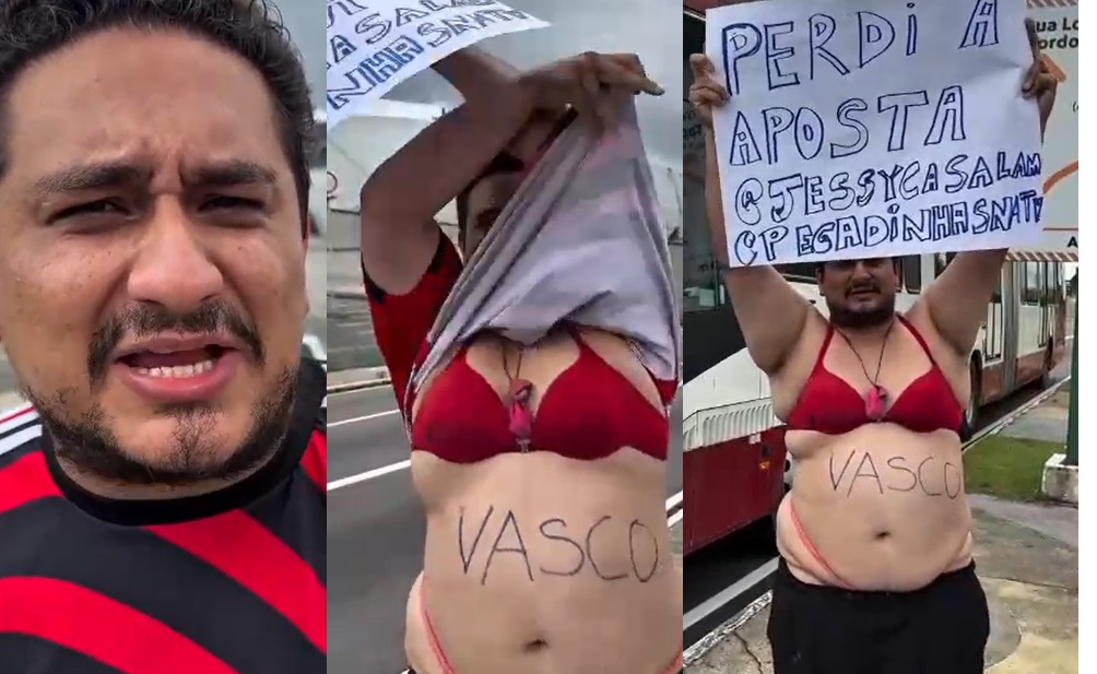 Ele foi filmado na frente da Arena da Amazônia, nesta quinta-feira (18), e ainda escreveu o nome do Vasco na barriga para pagar a aposta, usando calcinha e sutiã.