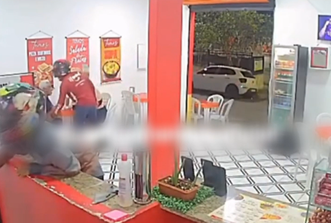 O primeiro suspeito, já de capacete, adentra o local e se aproxima do balcão, simulando ser um cliente. Enquanto ele distrai a atendente, olhando o cardápio, o segundo criminoso, também de capacete, invade o local anunciando o assalto e rendendo os clientes que estavam em uma mesa.