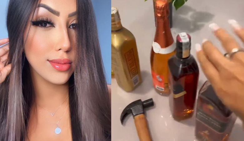 Nos stories, a influenciadora aparece com um martelo e garrafas de whisky, vodka, entre outros, que ela joga no chão da varanda do apartamento e também quebra com a ajuda do objeto.