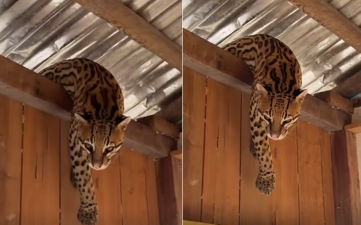 Uma jaguatirica macho foi encontrada sobre o telhado de uma residência flutuante na Área do Sacado, município de Carauari, a 787 quilômetros de Manaus, no interior do Amazonas. O animal, que parecia exausto e assustado, buscou abrigo no local após fortes chuvas que atingiram a região na madrugada de quarta-feira (21).