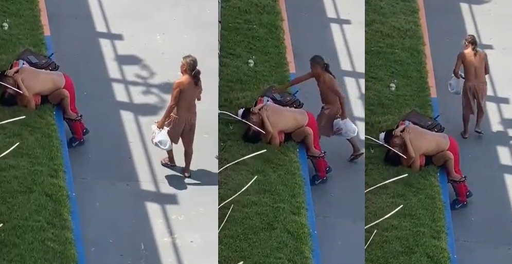 Nas imagem o homem está beijando e namorando a jovem, enquanto o ladrão passa, vê a cena, pega o celular em cima das coisas dos apaixonados e sai de boa.
