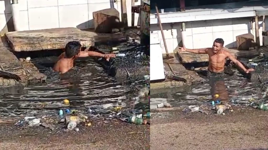 Um morador de Manacapuru, indignado com a situação do esgoto na Feira da Liberdade, entrou em um bueiro para realizar a limpeza por conta própria, nesta segunda-feira (23).