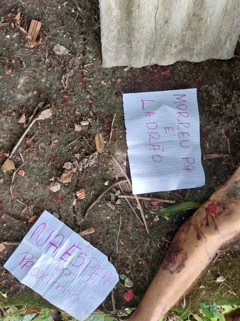 Além do pescoço degolado, ele sofreu vários hematomas pelo corpo, provavelmente de agressão. Com o corpo havia dois bilhetes: “Morreu pq é ladrão” e “Na espera do próximo”. O