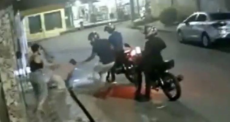 Além de puxarem arma, os bandidos cercam as três pessoas usando duas motos. São três criminosos. A senhora de mais idade cai no chão e, neste momento, é puxada pelos cabelos.