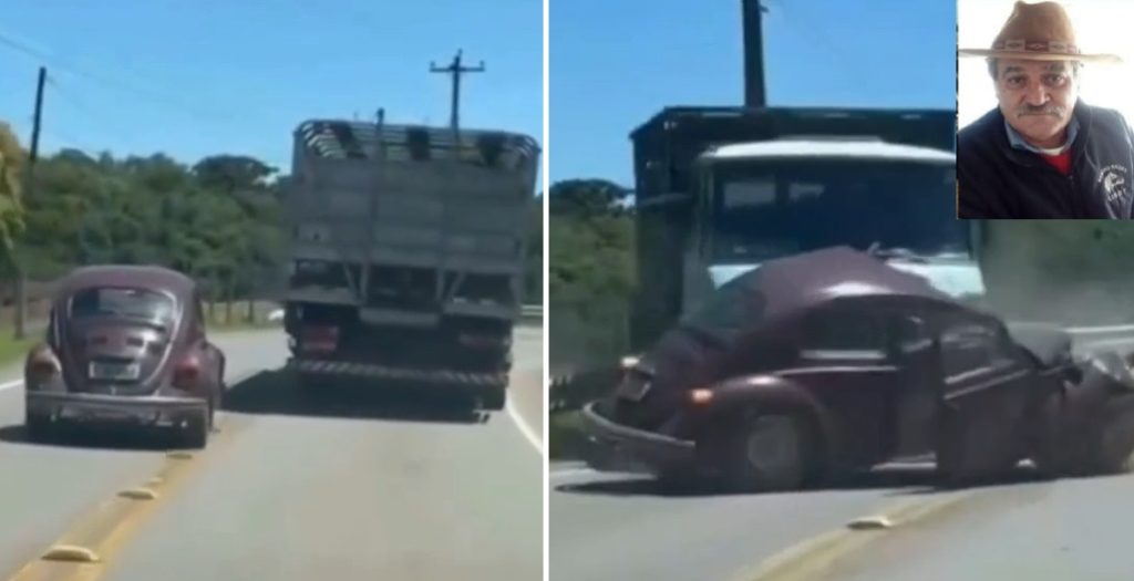 O idoso Celso Volpato, de 64 anos, morreu na estrada, nesta terça-feira (12), em Nova Roma do Sul, no interior do Rio Grande do Sul., ao tentar passar um caminhão pela contramão a bordo de seu Fusca.